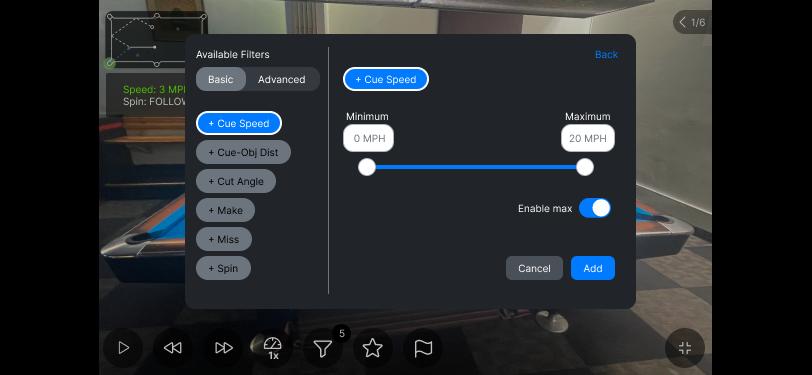 Filters were separated into “basic” for the most commonly used options, and “advanced” for options that are not strictly related to the pool shots