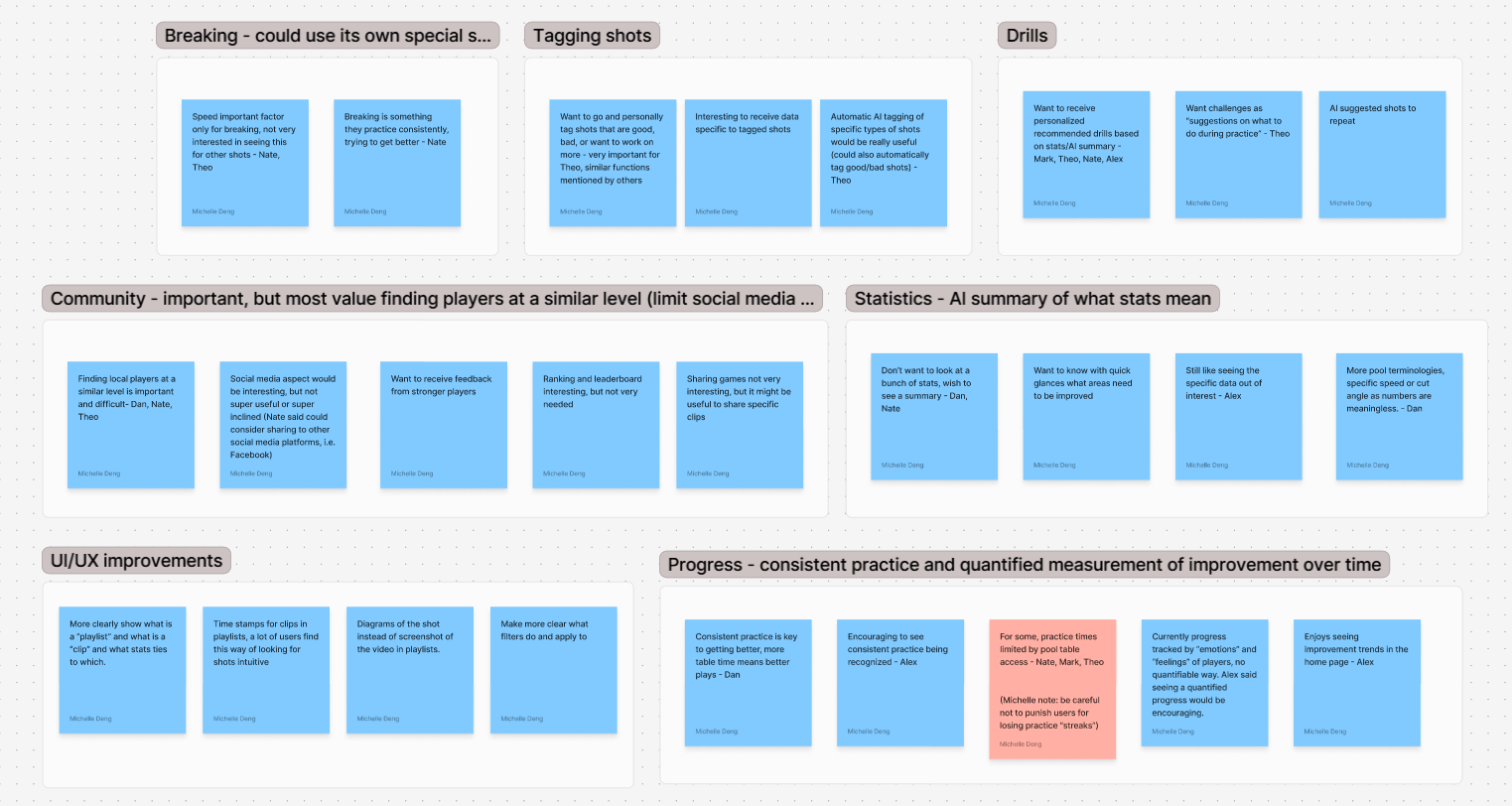 To help influence my design decisions, I conducted multiple lightweight qualitative user research studies where I interviewed pool players about their practice habits.